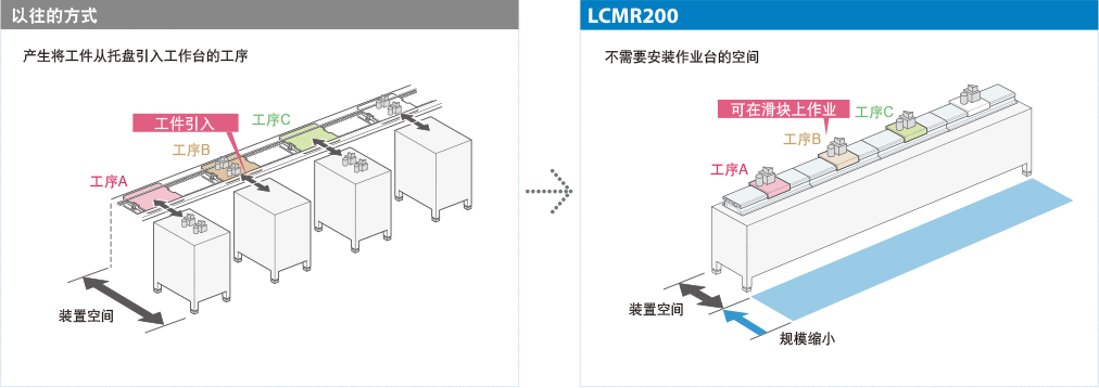 ● 省去了從搬運(yùn)線引入工作臺(tái)的工序,可精簡(jiǎn)裝置、降低成本。