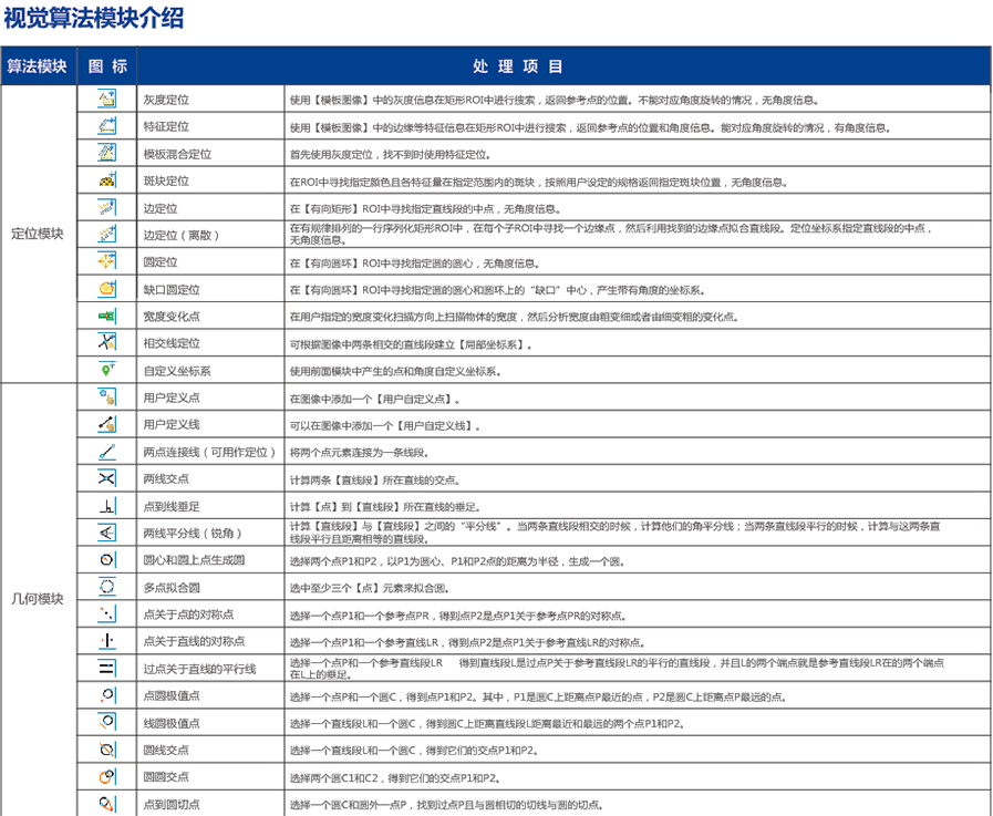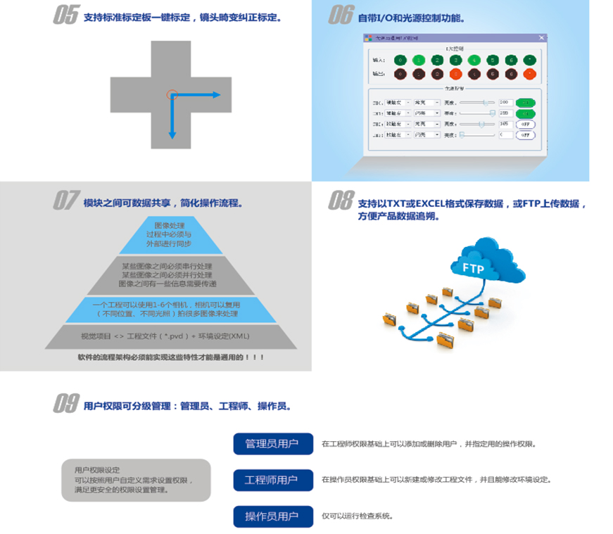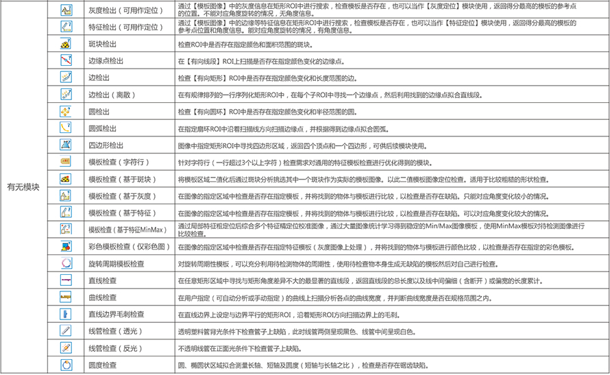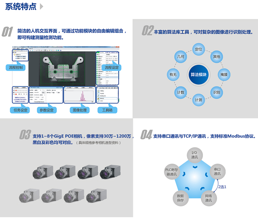 模塊化設(shè)置簡單快捷,快速對應(yīng) ,我們也可以根據(jù)客戶的實(shí)際需求,進(jìn)行新模塊的定制研發(fā)及實(shí)施。系統(tǒng)設(shè)定好相機(jī)觸發(fā)模式,并采集好圖像后,按照軟件的工作流程和邏輯,可從算法庫中選擇需要的模塊對圖像進(jìn)行處理分析,然后將處理結(jié)果以網(wǎng)絡(luò)、串口或IO通訊的方式發(fā)送給客戶端及執(zhí)行機(jī)構(gòu)。