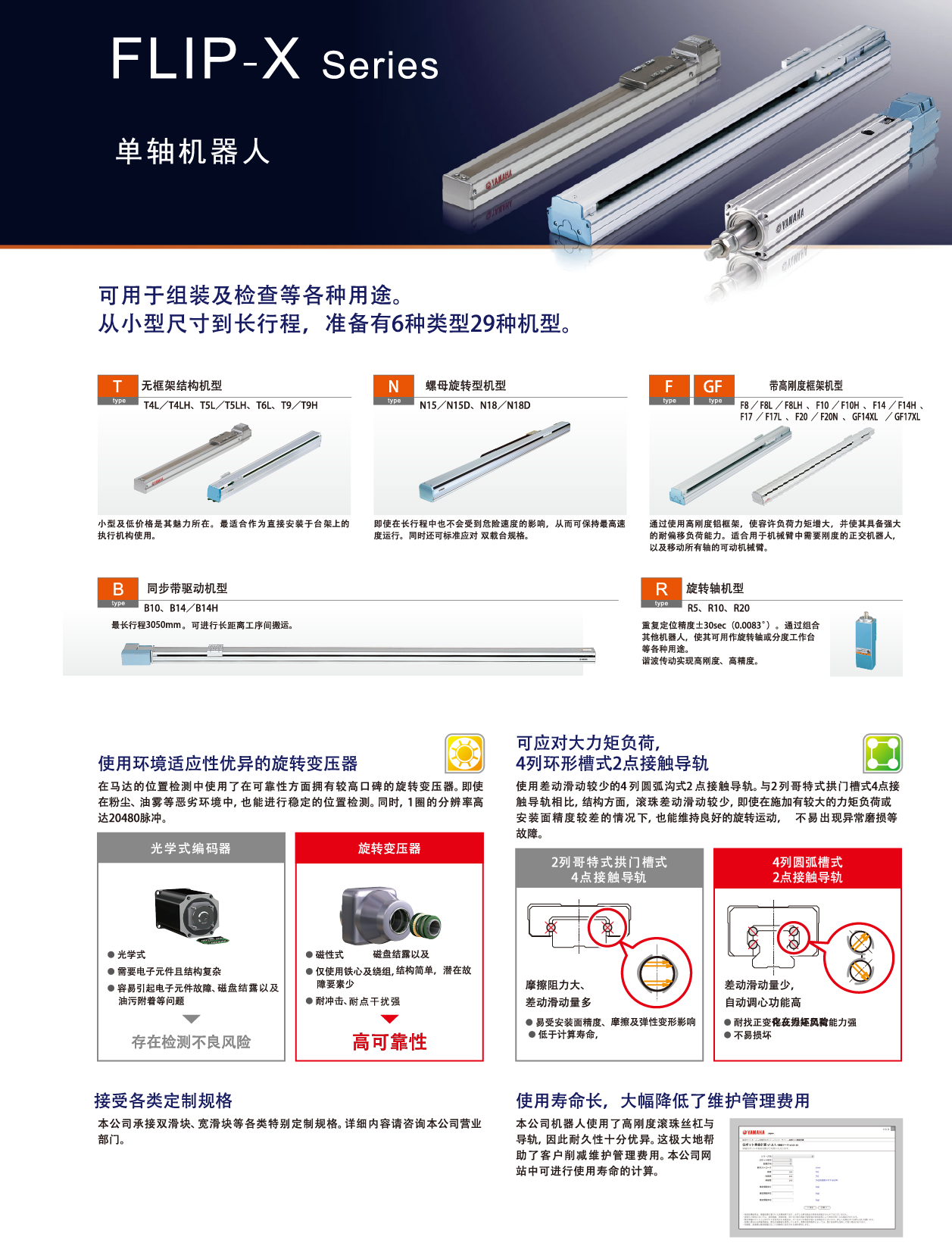 FLIP-X系列是由AC伺服馬達(dá)、底座、滾珠絲杠、皮帶、線性導(dǎo)軌等組成的電動執(zhí)行器,可用于組裝、檢查等各種工序,是具有廣泛用途的通用型機(jī)器人。 利用高剛性的滾珠絲杠與導(dǎo)軌,位置檢出器采用耐環(huán)境性極高的旋轉(zhuǎn)變壓器,因而它具有產(chǎn)品使用壽命長的特點(diǎn)??捎兄蠓冉档途S護(hù)管理費(fèi)用。