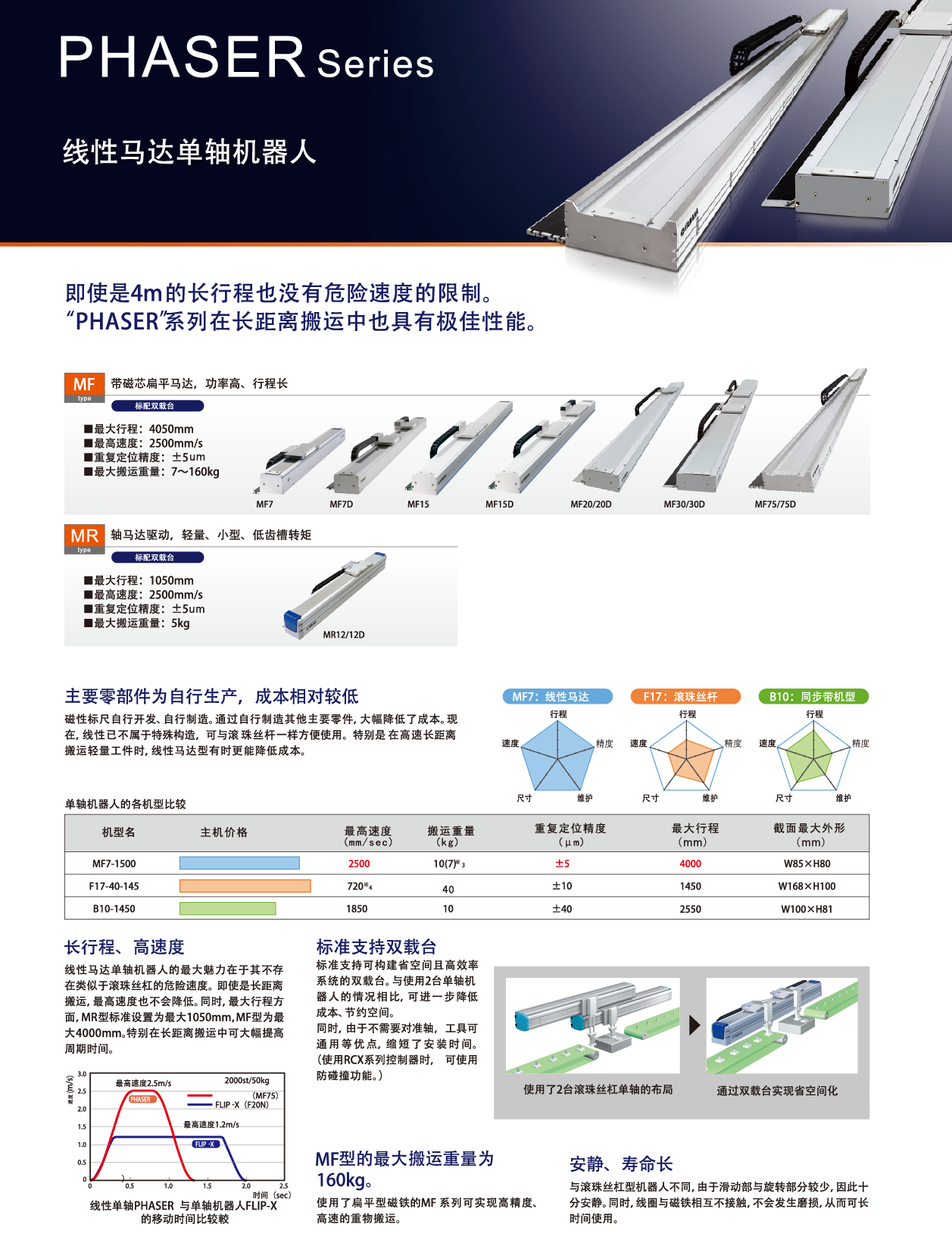 PHASER系列是隨著制造設(shè)備的大型化、工廠內(nèi)搬運(yùn)設(shè)備的高速化,為滿足長行程、高速、高精度的市場需求而開發(fā)的線性馬達(dá)執(zhí)行器。