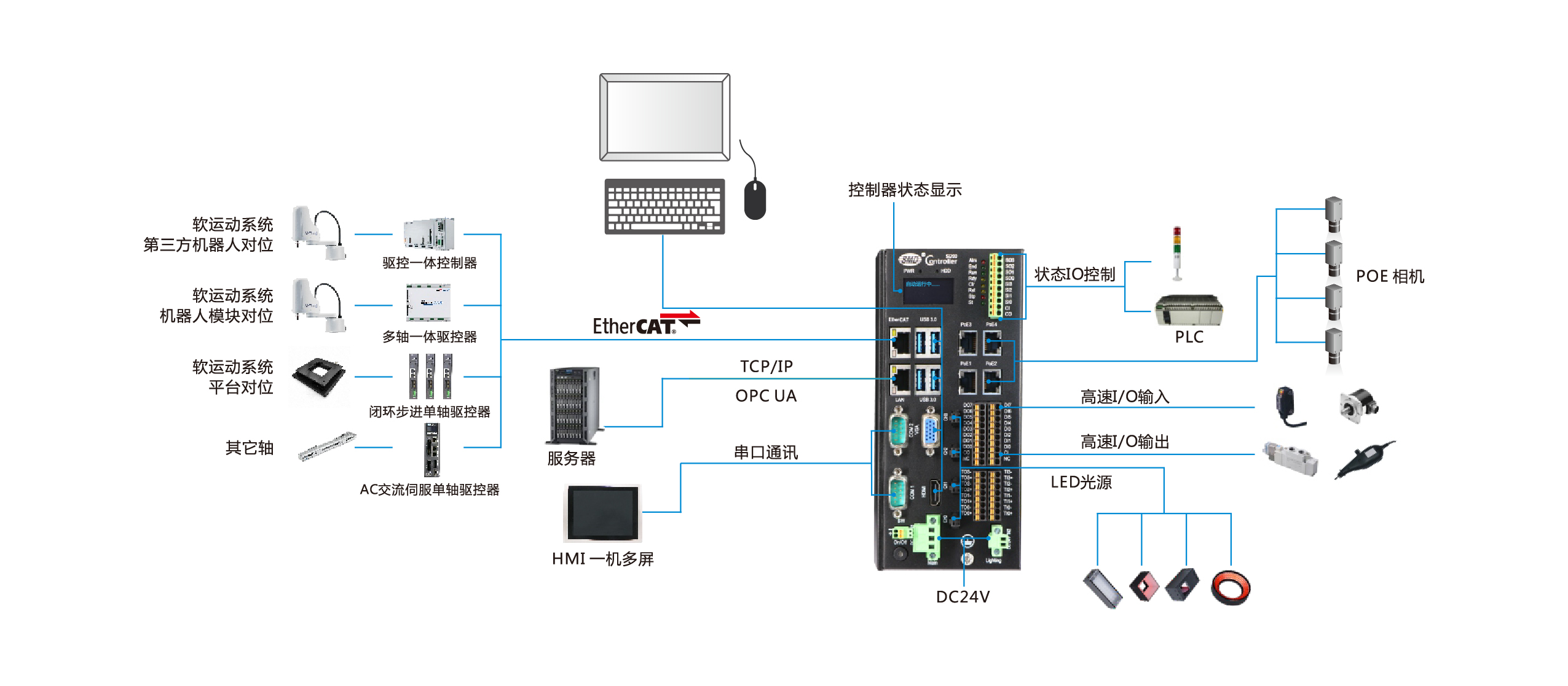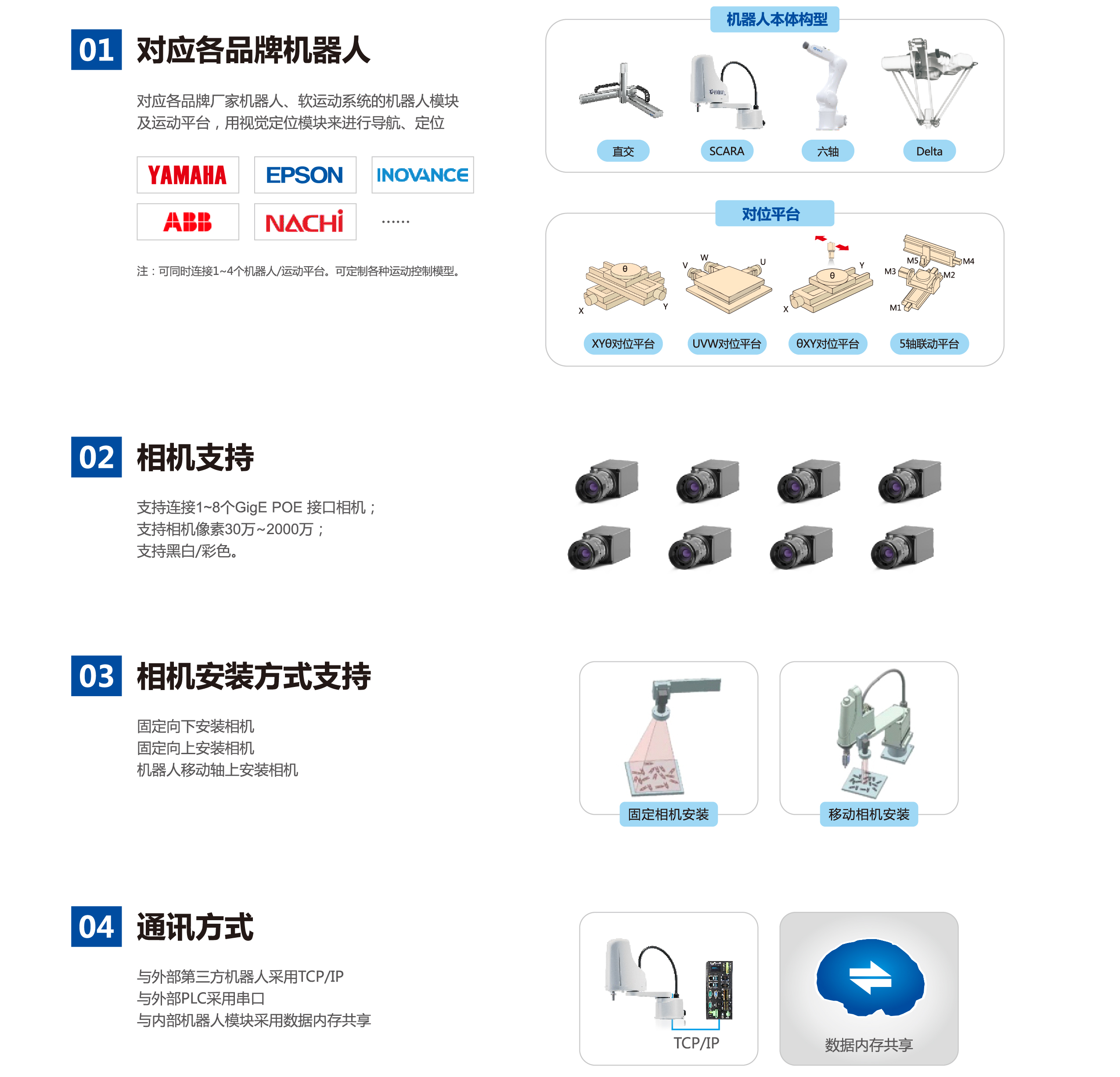 多種多樣的圖像處理功能與視覺定位對(duì)位功能,滿足各種各樣的定位對(duì)位需求及簡(jiǎn)易測(cè)量、 檢測(cè)、 識(shí)別等需求,不僅功能豐富還可以根據(jù)客戶需求進(jìn)行功能定制。 多種定位對(duì)位補(bǔ)償算法,補(bǔ)償自動(dòng)計(jì)算,大大節(jié)約調(diào)試時(shí)間。 多種通訊方式,滿足不同類型的通訊需求。 支持幾乎所有類型的工業(yè)機(jī)器人及運(yùn)動(dòng)平臺(tái)的構(gòu)型。