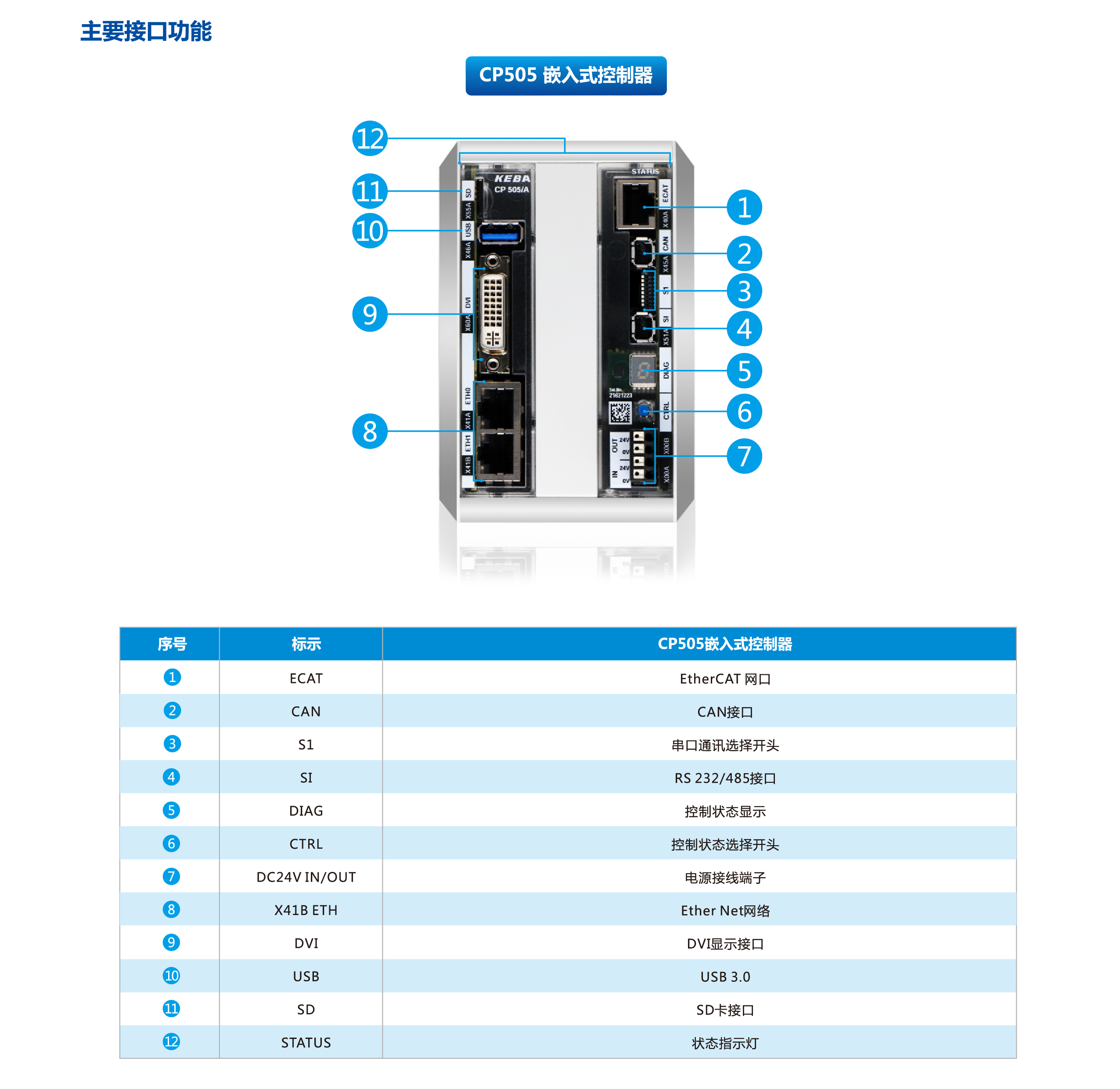 KEBA公司CP505 是 KeControl C5 系列的無風(fēng)扇CPU, 具有多種標(biāo)準(zhǔn)接口和擴(kuò)展選項。它是常規(guī)控制任務(wù)的最優(yōu)控制的最佳選擇,同樣它也能勝任計算密集型的應(yīng)用。伴隨著搭載的CAN接口和串行接口,所有的任務(wù)都可以經(jīng)濟(jì)有效的解決。在控制器左側(cè),與USB和SATA相結(jié)合的PCIE連接為附加外圍設(shè)備提供了高靈活性。由千它高質(zhì)量的圖形化性能,它也能夠在控制器上直接運(yùn)行可視化應(yīng)用程序。 DVI接口的輸出允許在任何輸出設(shè)備上顯示。