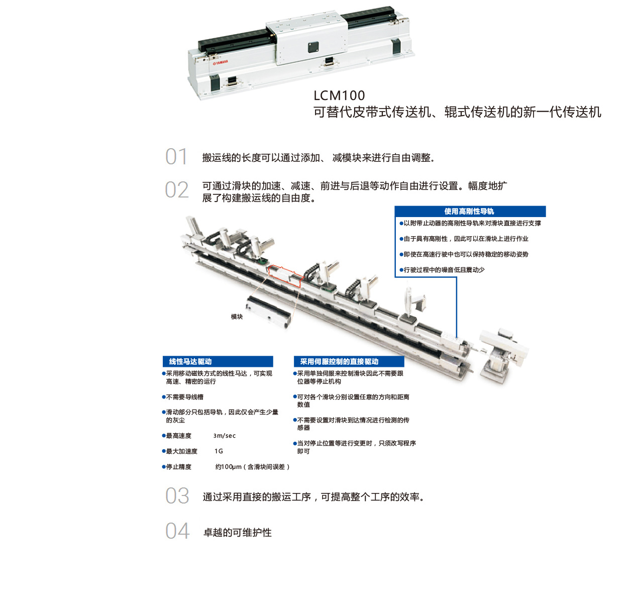 替代自由流動(dòng)式傳送機(jī)、帶式傳送機(jī)的新一代搬運(yùn)系統(tǒng)——線性傳送模組??梢造`活自由地構(gòu)建制造生產(chǎn)線,尤其適合多品種小批量的生產(chǎn)。