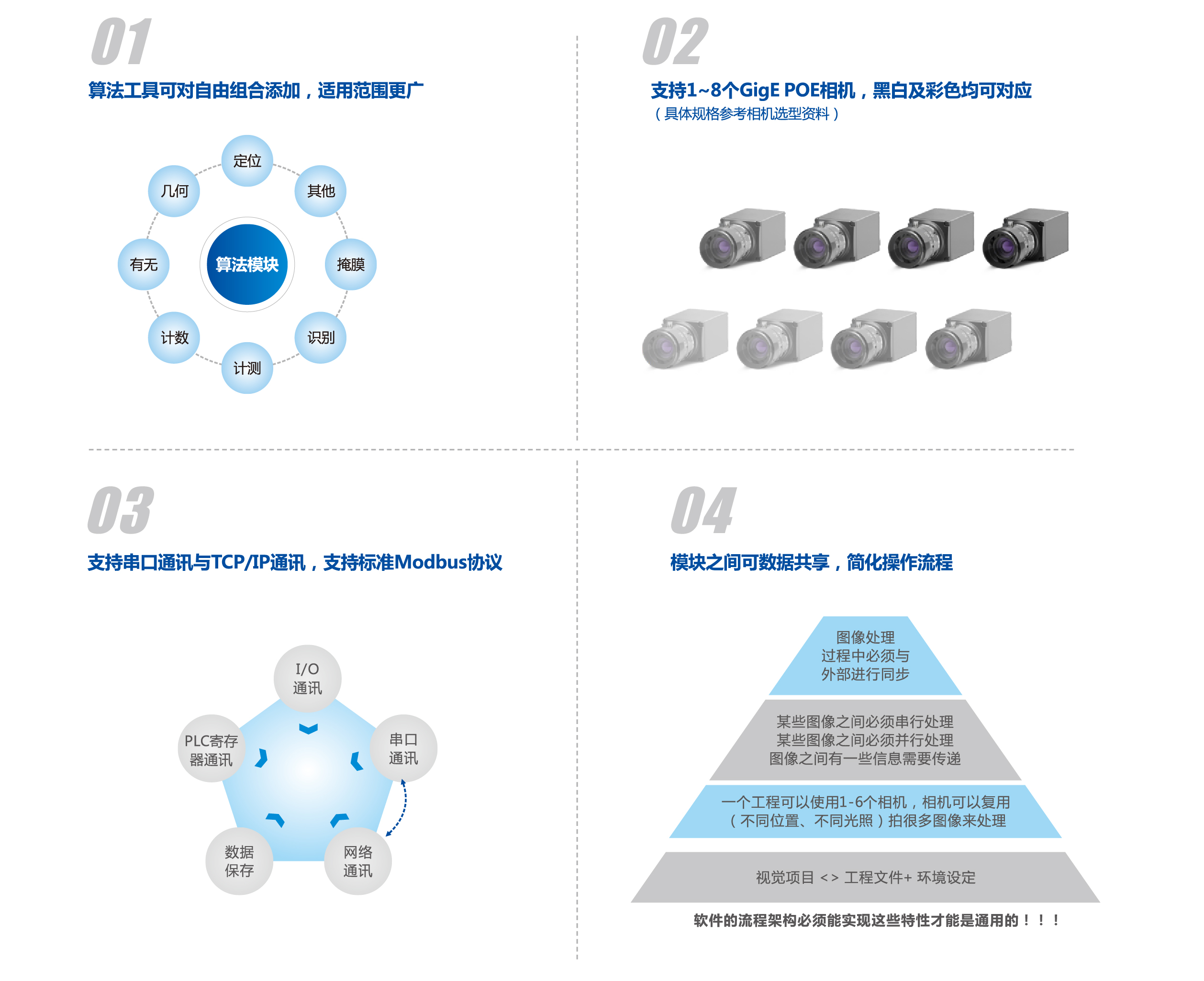 模塊化設(shè)置簡單快捷,快速對應(yīng)。 多種多樣的圖像處理功能與視覺對位功能,滿足多種多樣的定位對位、 測量、 識別等需求,多種定位對位補(bǔ)償算法,大大節(jié)約調(diào)試時間。 多種通訊方式,滿足不同類型的通訊需求。
