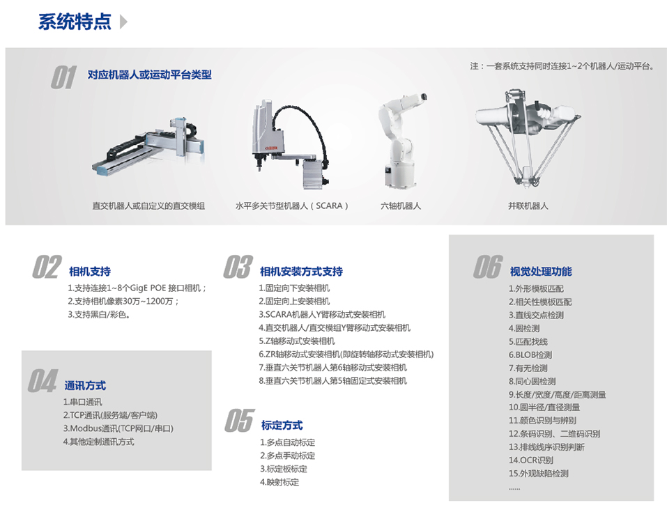 多種多樣的圖像處理功能與視覺定位對位功能,滿足各種各樣的定位對位需求及測量、檢測、識別等需求,不但功能豐富還可以根據(jù)客戶需求進(jìn)行功能定制。 多種定位對位補(bǔ)償算法,補(bǔ)償自動(dòng)計(jì)算,大大節(jié)約調(diào)試時(shí)間。多種通訊方式,滿足不同類型的通訊需求。支持幾乎所有類型的工業(yè)機(jī)器人運(yùn)動(dòng)平臺和直交運(yùn)動(dòng)模組。