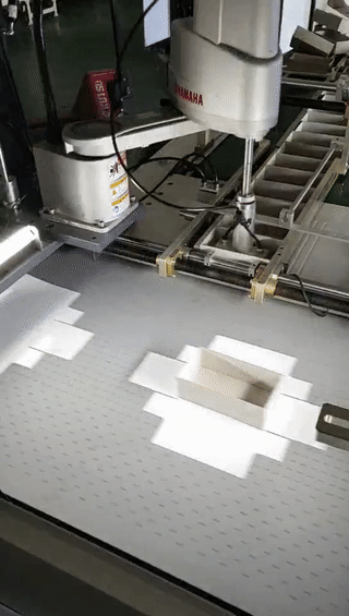 速美達(dá)紙盒紙板貼合項(xiàng)目均是利用YAMAHA四軸機(jī)器人與速美達(dá)自研視覺系統(tǒng)進(jìn)行協(xié)作完成的,通過四軸機(jī)器人將預(yù)定位置的紙盒吸取并按照設(shè)定的軌跡移動(dòng)至面紙上方,再將紙盒進(jìn)行視覺定位精準(zhǔn)的貼合于面紙上,以此達(dá)到貼合的目的。