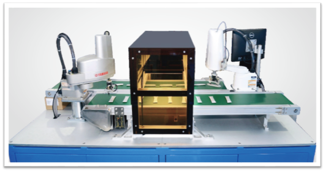 此樣機展示SCARA機器人跟隨傳送帶同步取放料的功能。使用醫(yī)用試劑盒作為演示產(chǎn)品,兩臺SCARA機器人協(xié)同作業(yè),高速,精密,機器人的最高CT可做到60PPM。