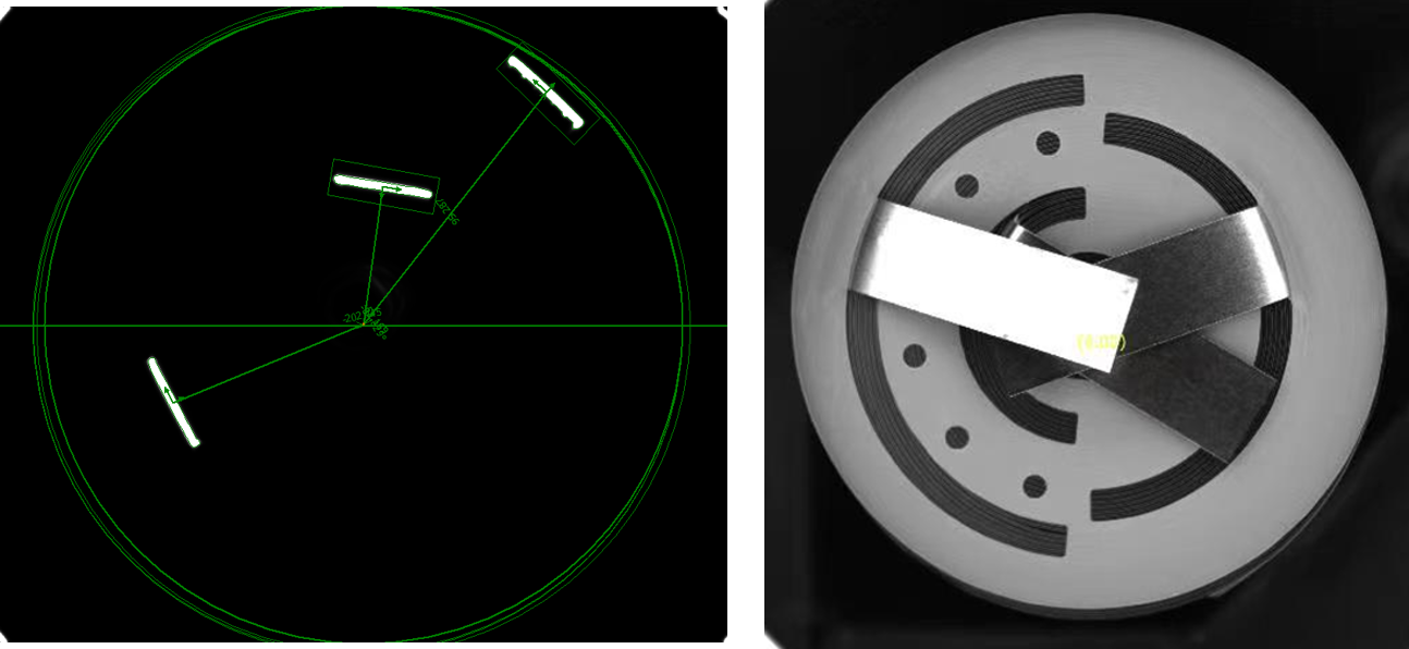 通過工業(yè)相機、光源及鏡頭的硬件配合,將被拍攝圓柱電芯極耳進行定位成像傳送至速美達視覺軟件中,根據極耳成像效果計算內中外極耳最佳角度,完成面墊入殼極耳折彎操作,同時采用深度學習對折彎后的效果進行判定,樣本越多越精準。