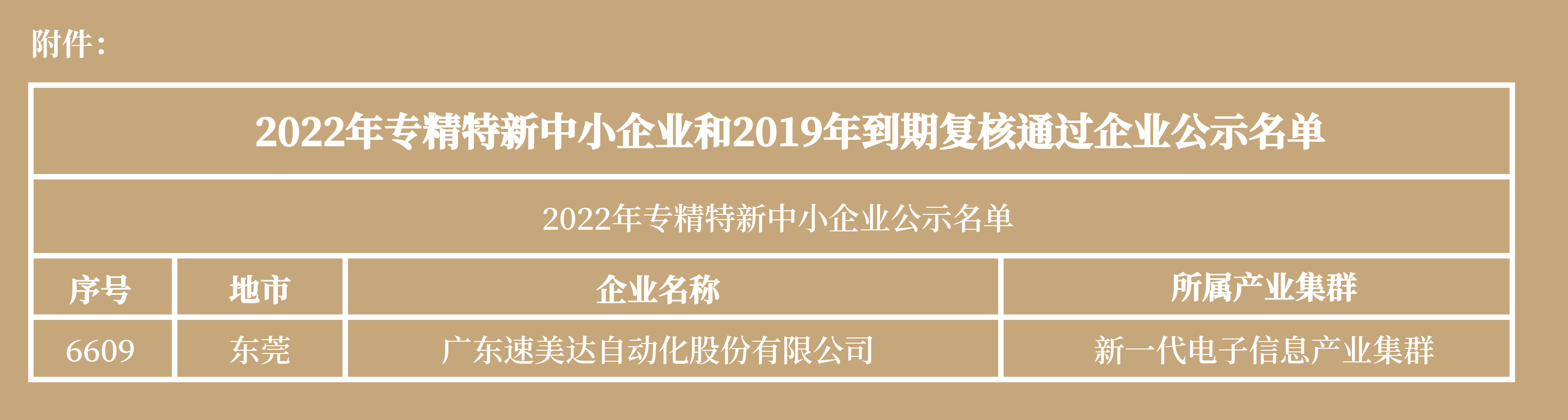 1月6日,廣東省工業(yè)和信息化廳發(fā)布了《關(guān)于2022年專精特新中小企業(yè)名單的公示》,廣東速美達(dá)自動(dòng)化股份有限成功入選,順利通過廣東省“專精特新”中小企業(yè)認(rèn)定。